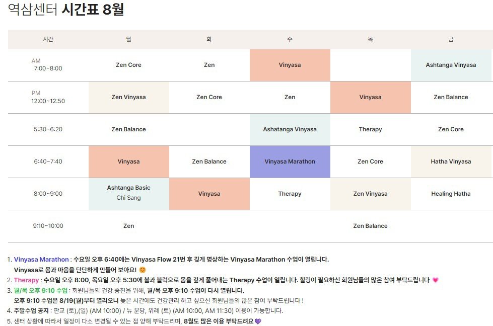 8월 시간표 입니다! 다음 주면 9월이라 시간표가 바뀌겠지만, 요가 타임들은 변경이 없다고 합니다.